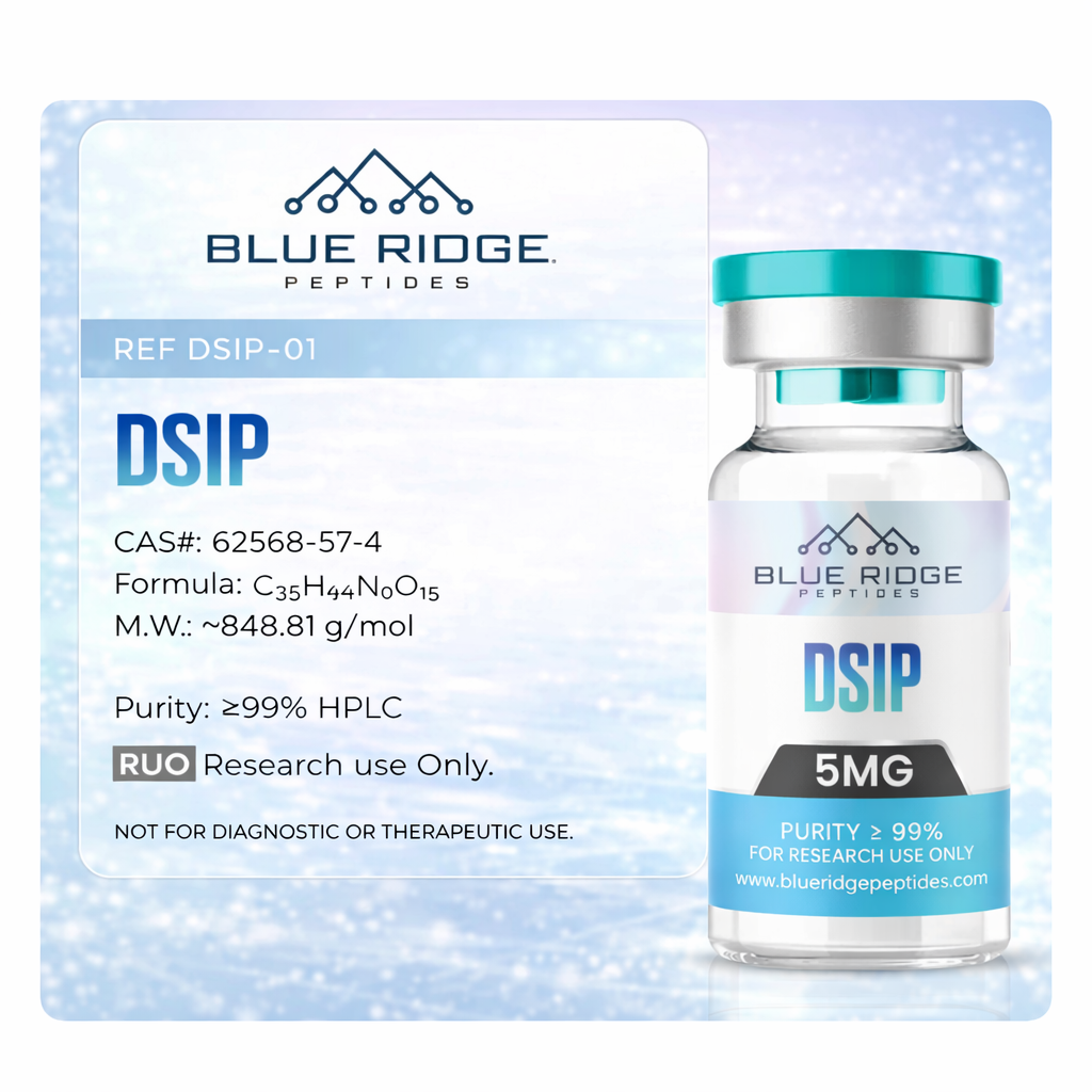 Blue Ridge Peptides supplies DSIP strictly for laboratory research, analytical testing, and in-vitro scientific investigation. This material is not intended for human or animal use and is not approved for therapeutic or diagnostic applications.