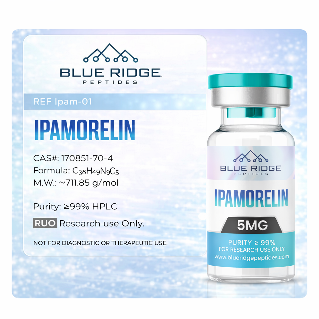 Ipamorelin supplied by Blue Ridge Peptides is intended exclusively for laboratory research, analytical testing, and in-vitro scientific investigation. This product is not intended for human or animal use and is not approved for therapeutic or diagnostic applications.