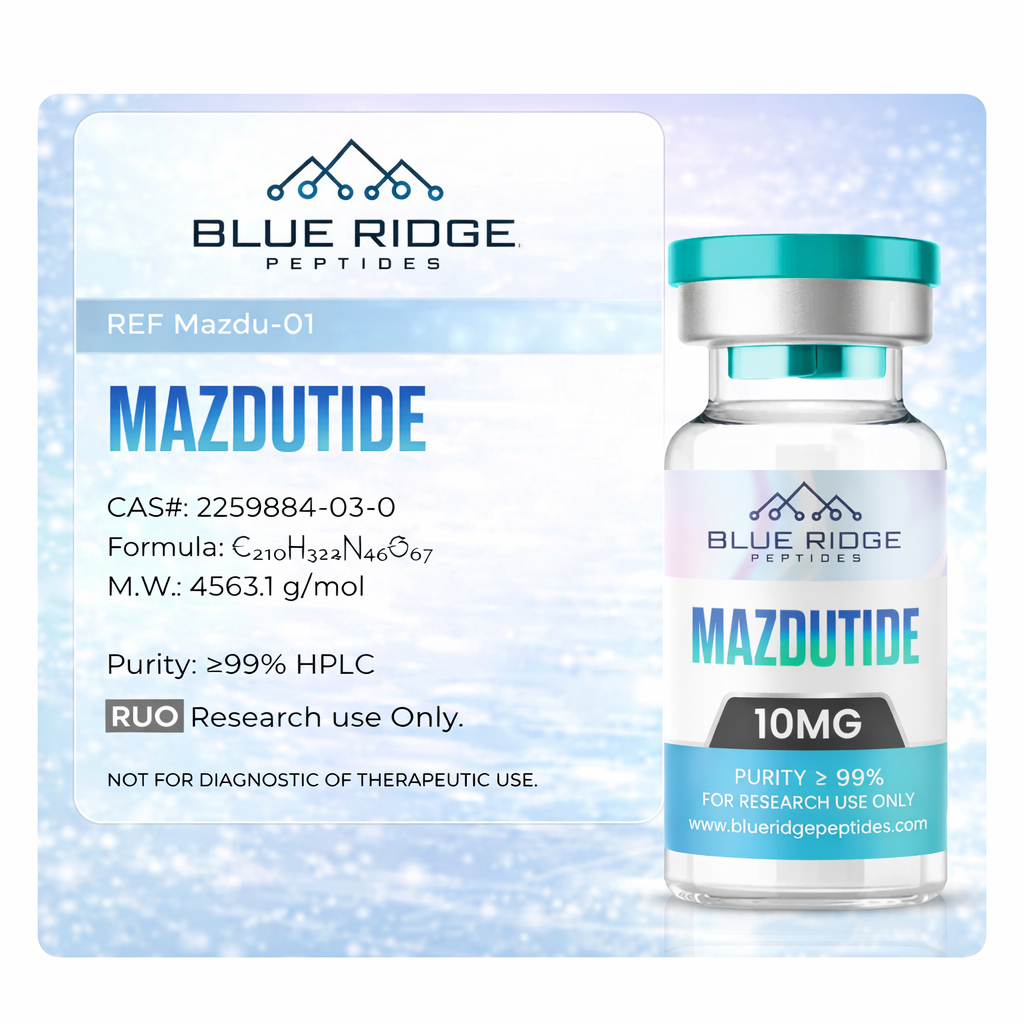 Mazdutide supplied by Blue Ridge Peptides is intended exclusively for laboratory research, analytical testing, and in-vitro scientific investigation. This product is not intended for human or animal use and is not approved for therapeutic or diagnostic applications.