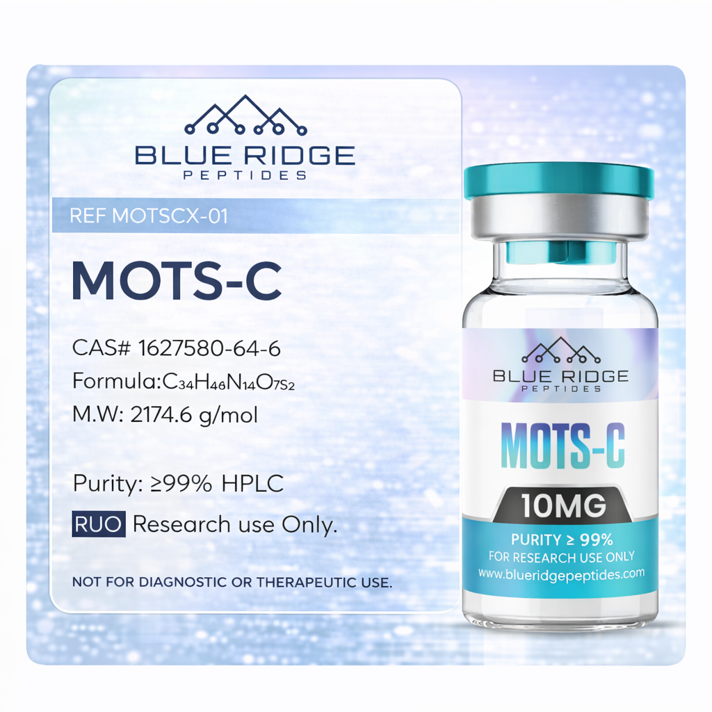 MOTS-C supplied by Blue Ridge Peptides is intended exclusively for laboratory research, analytical testing, and in-vitro scientific investigation. This product is not intended for human or animal use and is not approved for therapeutic or diagnostic applications.